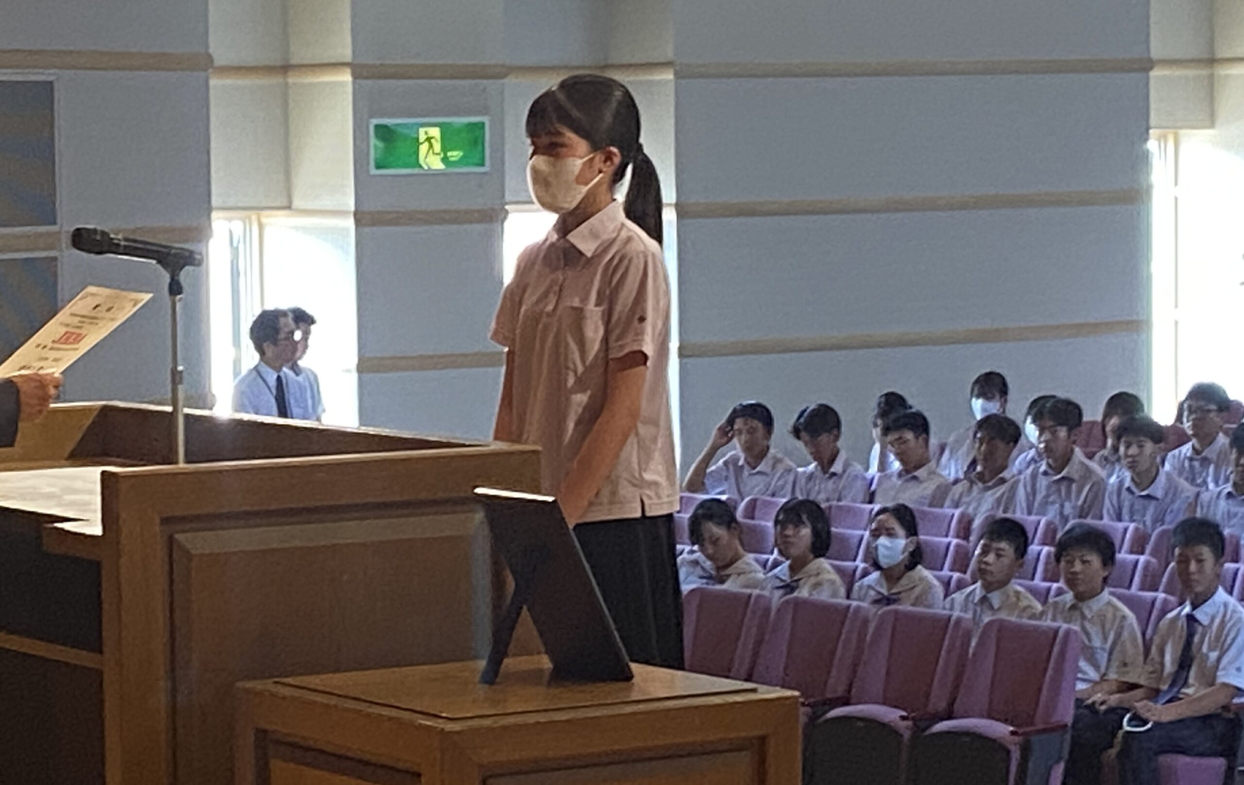 続いて、表彰伝達が行われました。夏休み中に行われた「高体連ボウリング全国選抜大会京都大会」にて見事優勝を果たした高校3年・吉田知佳さんの功績が紹介され、全校生徒から大きな拍手が送られました。