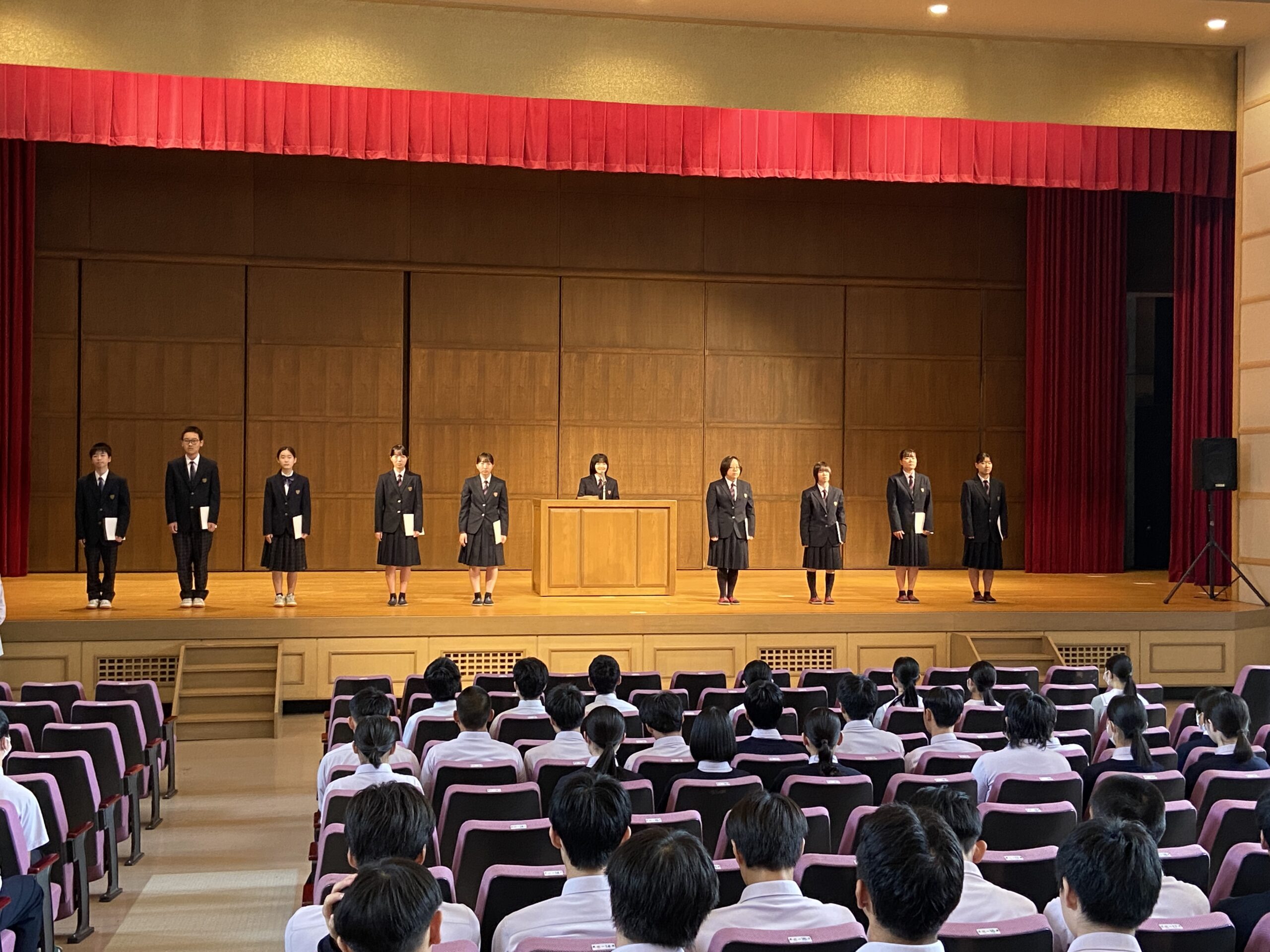 式では、新生徒会長より力強い挨拶がありました。「挨拶ができる学校にしたい」「生徒が悩み事をひとりで抱え込まず、誰かに相談できるような学校にしたい」と語り、誰もが安心して過ごせる温かい学校づくりへの思いが伝わってきました。