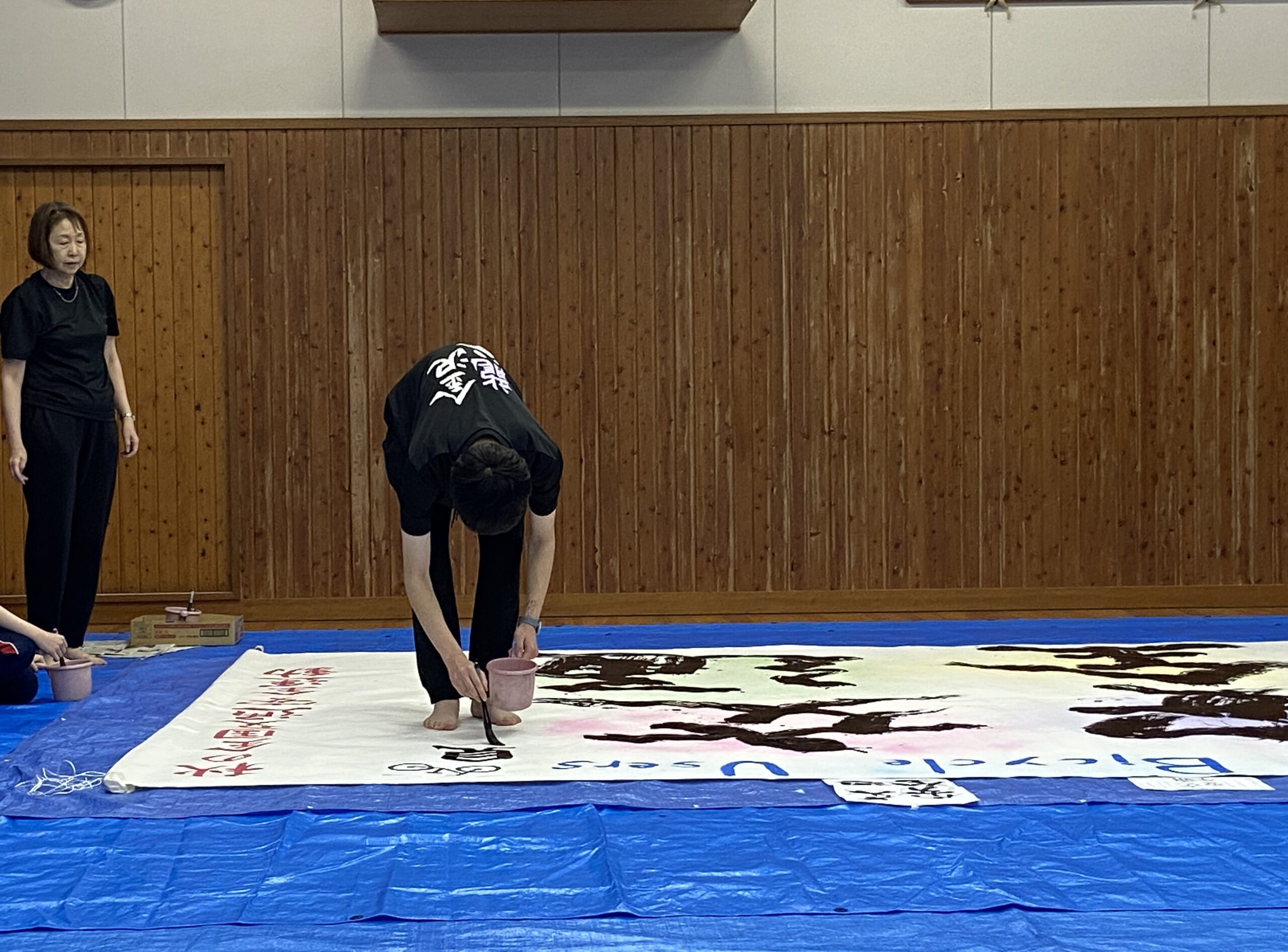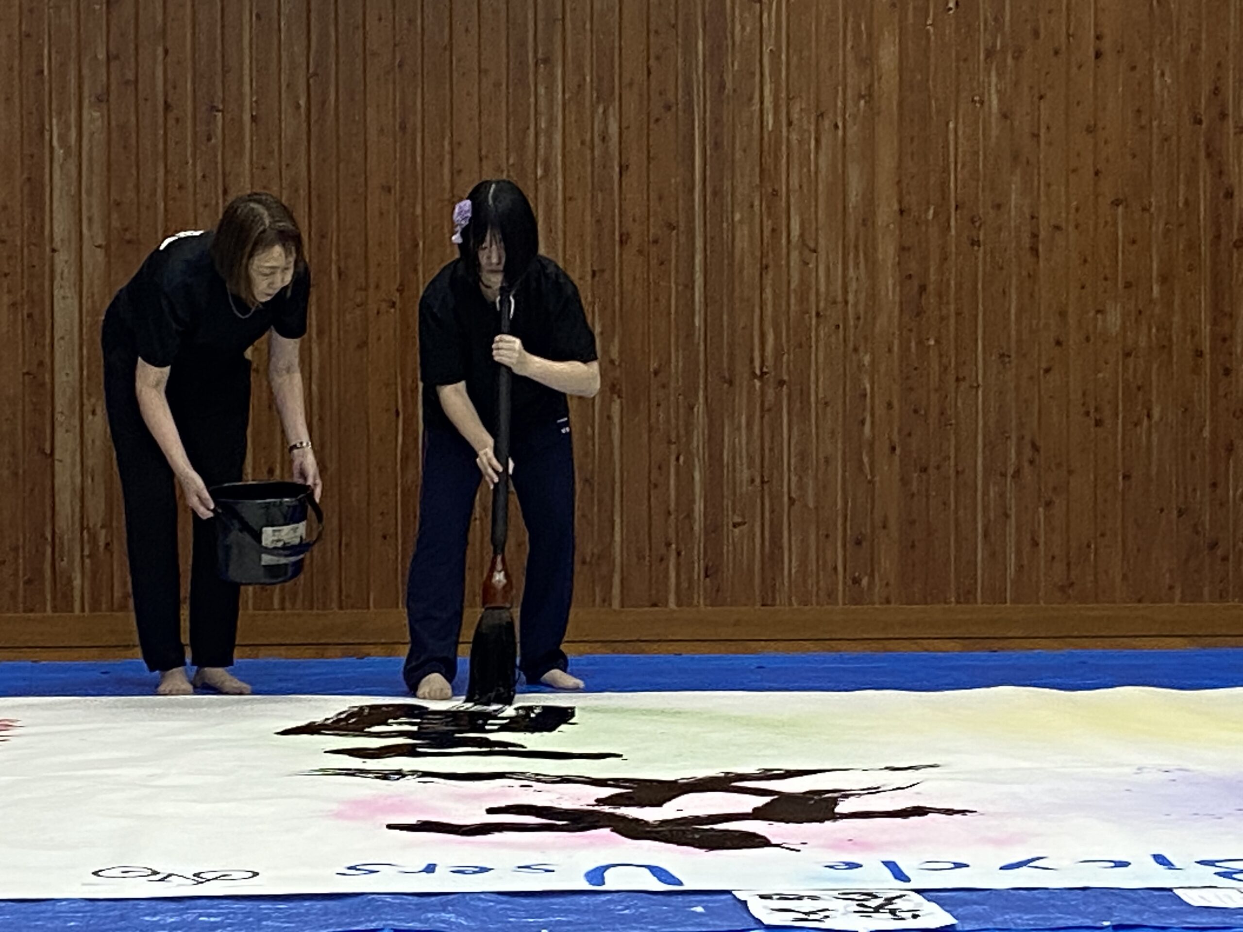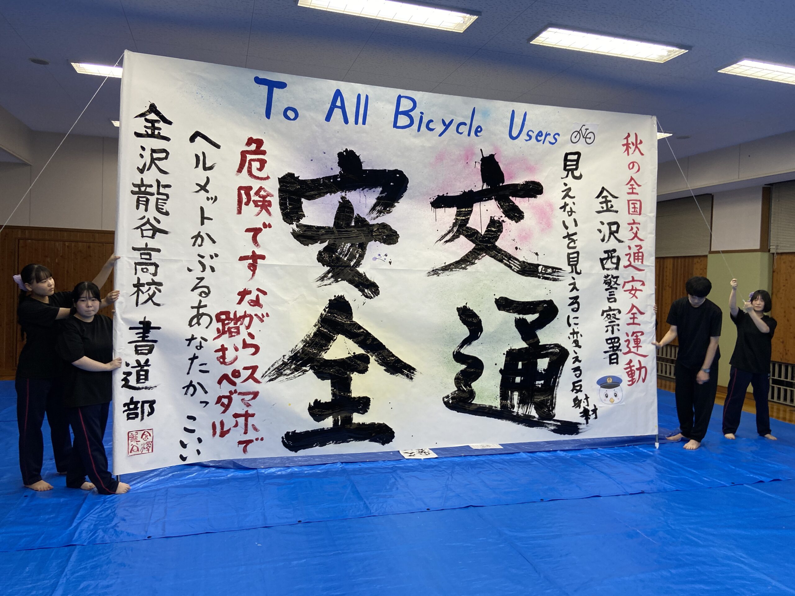 金沢西警察署で行われた「秋の交通安全運動オープニングセレモニー」において、本校書道部がパフォーマンスを披露しました。警察署職員のみなさまや保護者の方々など多くの来場者が見守る中、音楽に合わせて力強く筆を走らせ、交通安全への願いを込めた作品を完成させました。