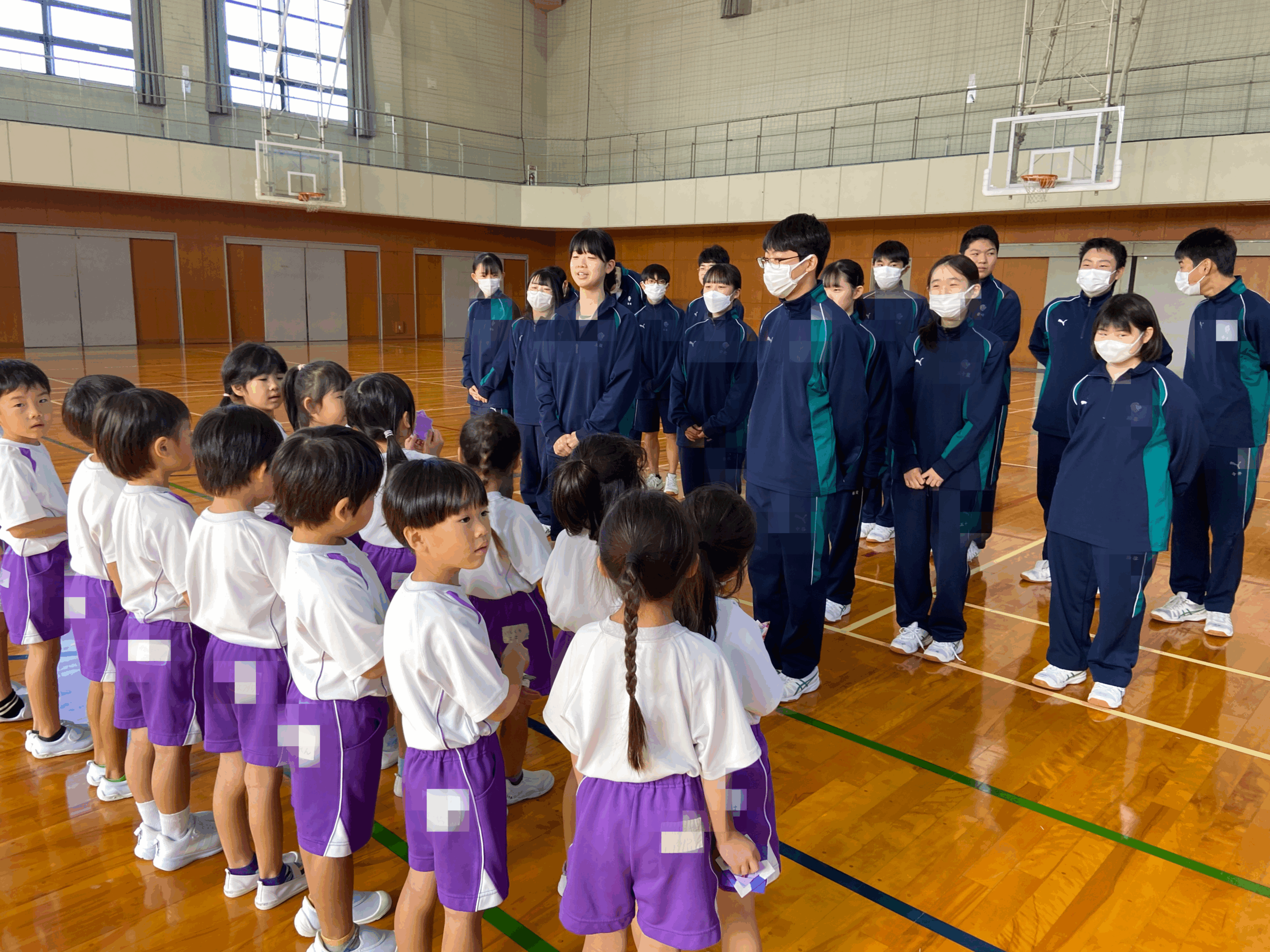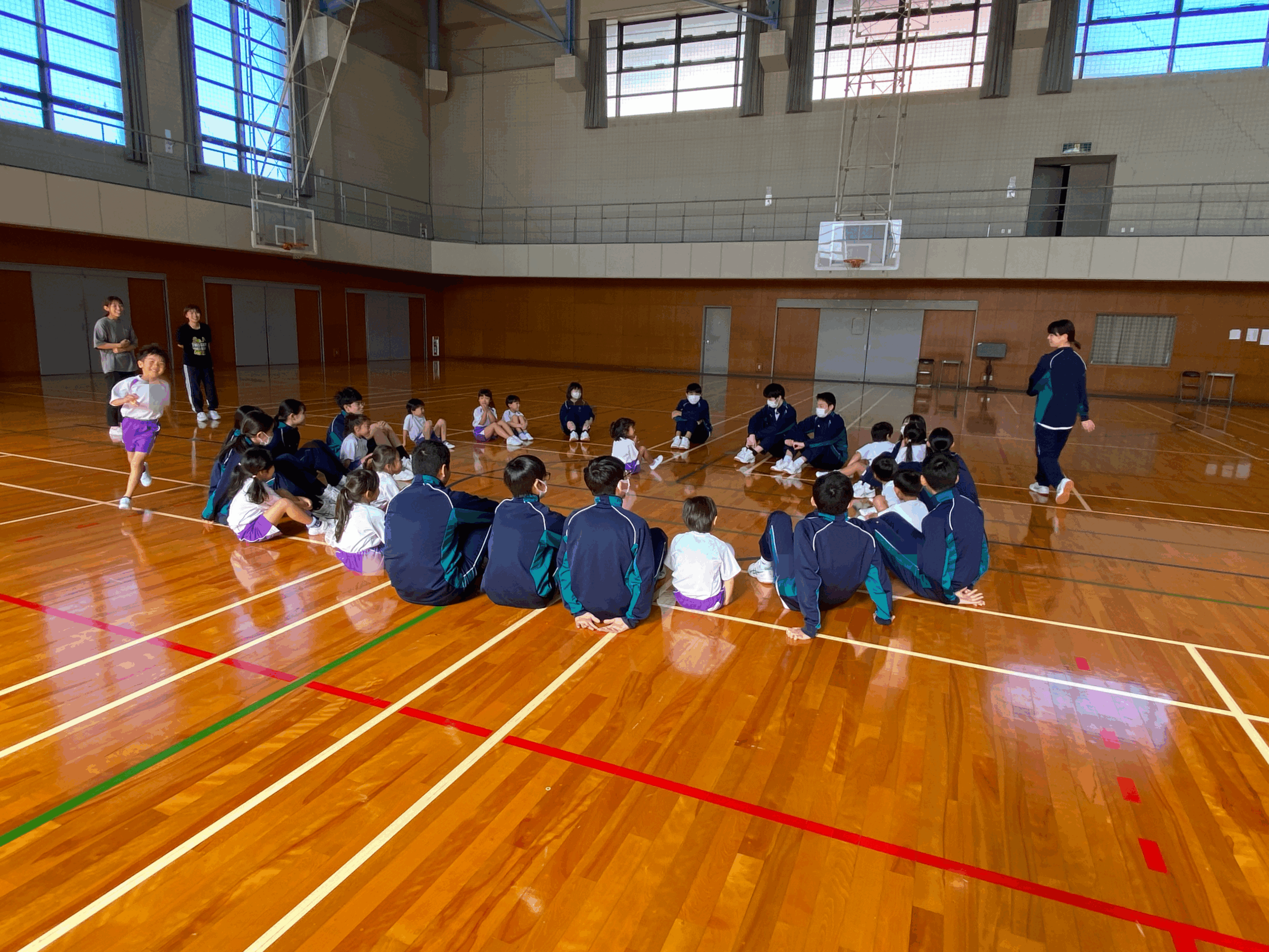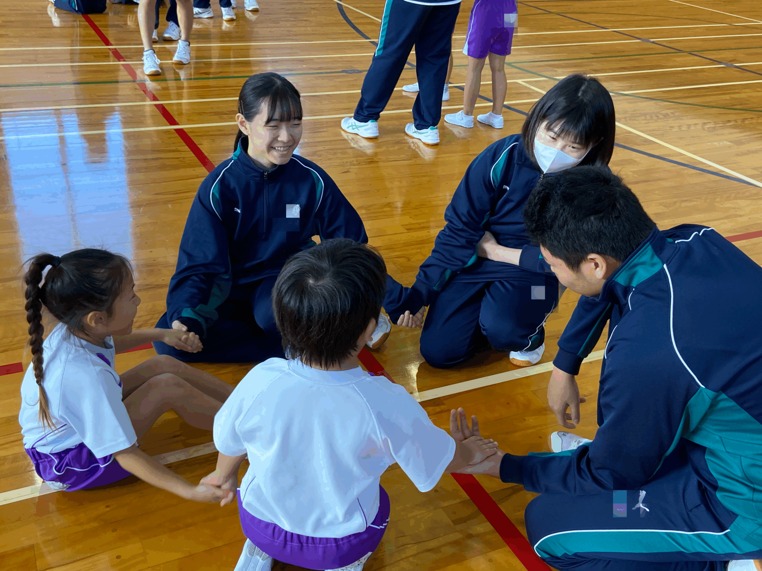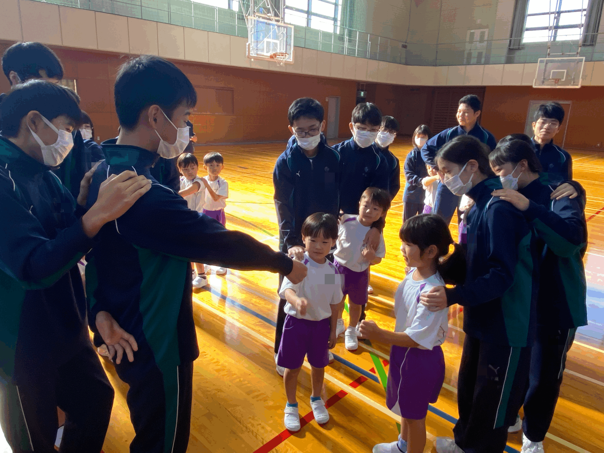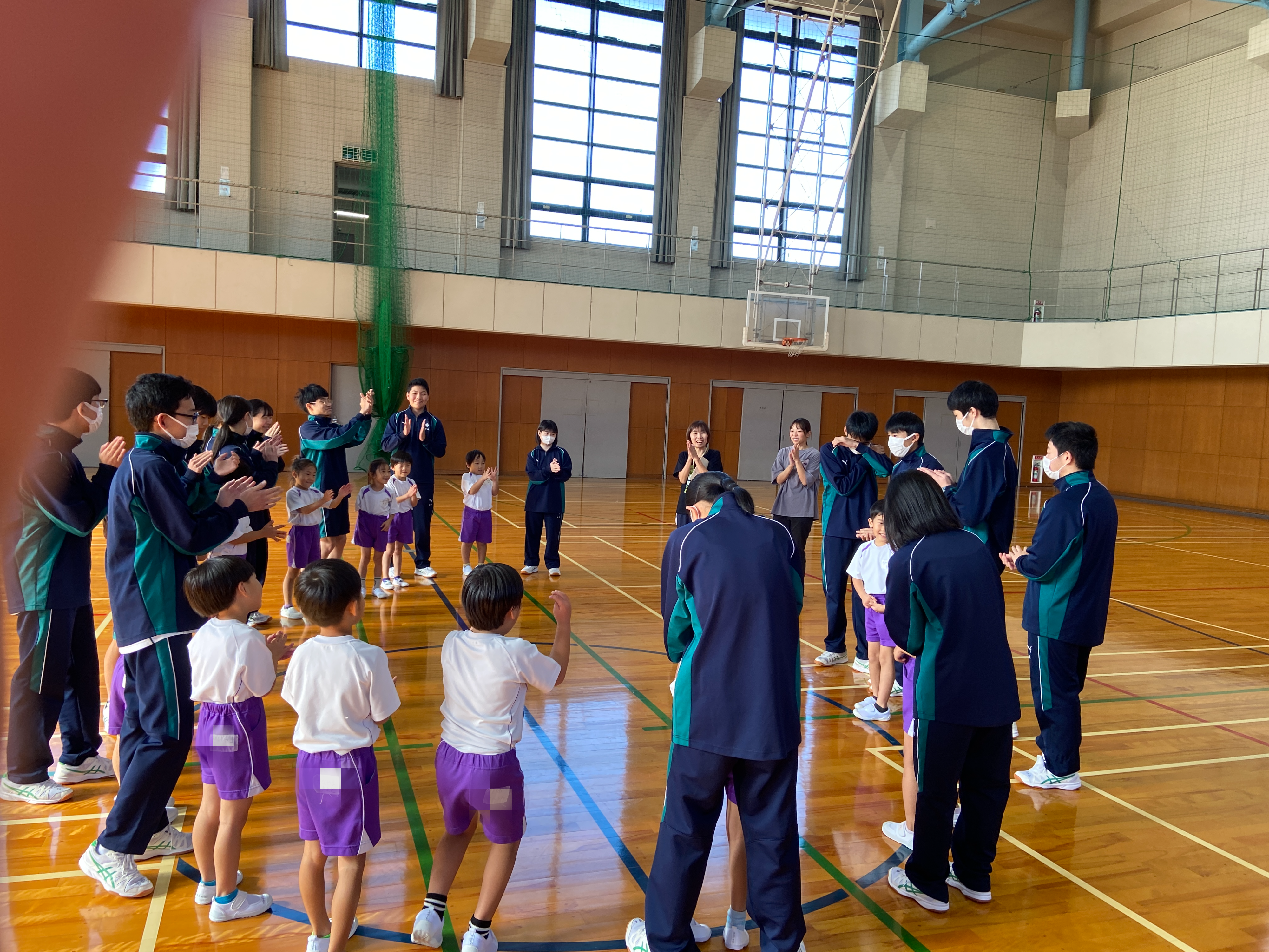 「猛獣狩りに行こうよ!」「ジャンケン汽車ぽっぽ」「ハンカチ落とし」など、さまざまなゲームを一緒に楽しみました。はじめはお互いに少し恥ずかしそうな様子でしたが、時間が経つにつれて笑顔が増え、最後には名前を教え合うなど、すっかり仲良くなりました。