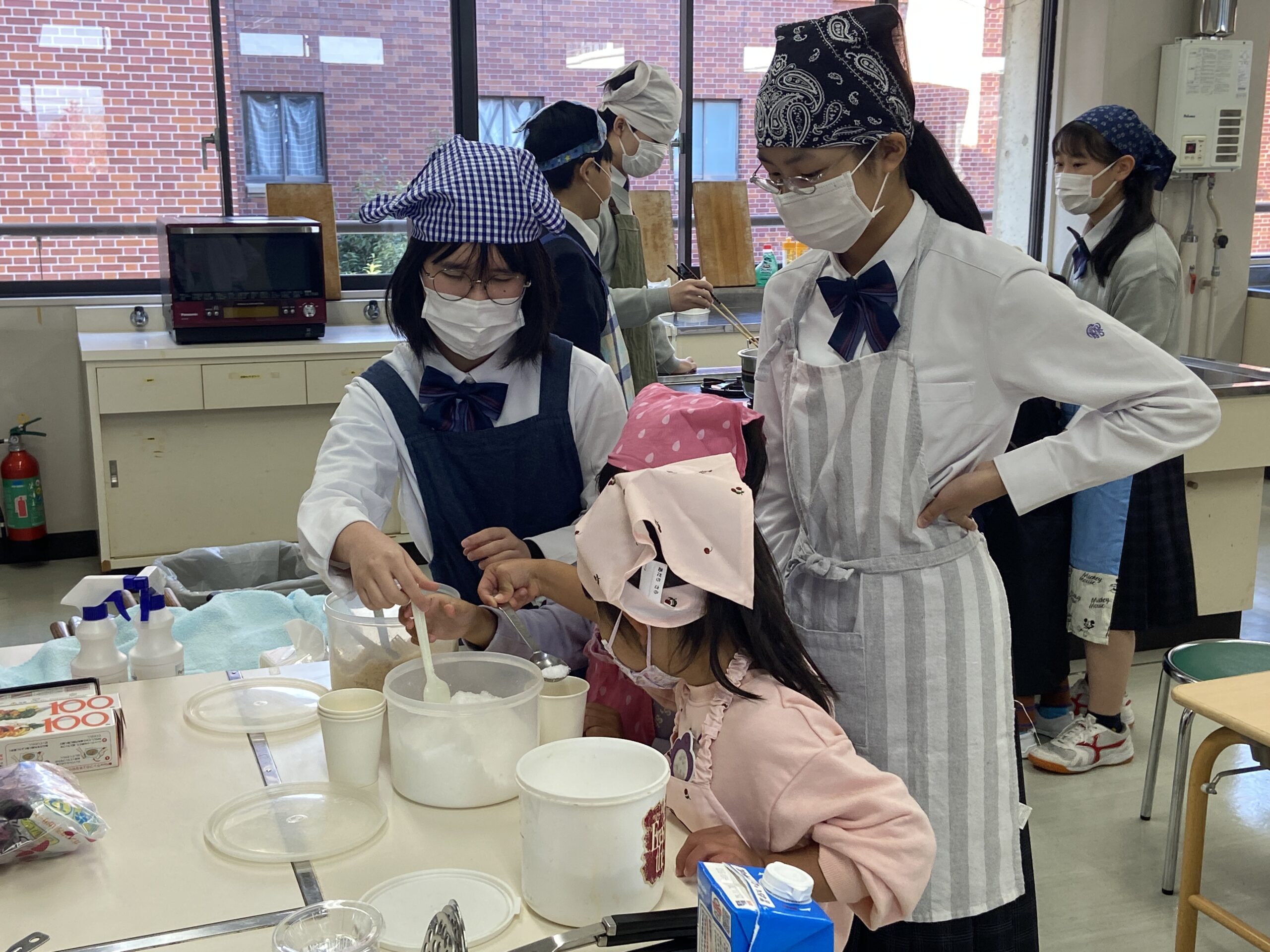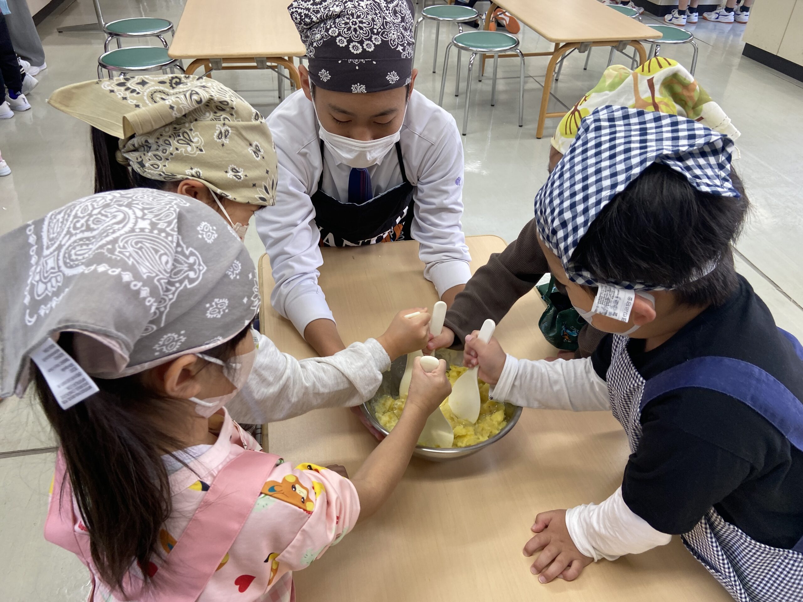 園児たちは、さつまいもをつぶしたり、丸めたりと楽しそうに調理に参加しました。焼きあがったスイートポテトをおいしそうに食べる園児の姿を見て、生徒たちもとてもうれしそうな表情を浮かべていました。
