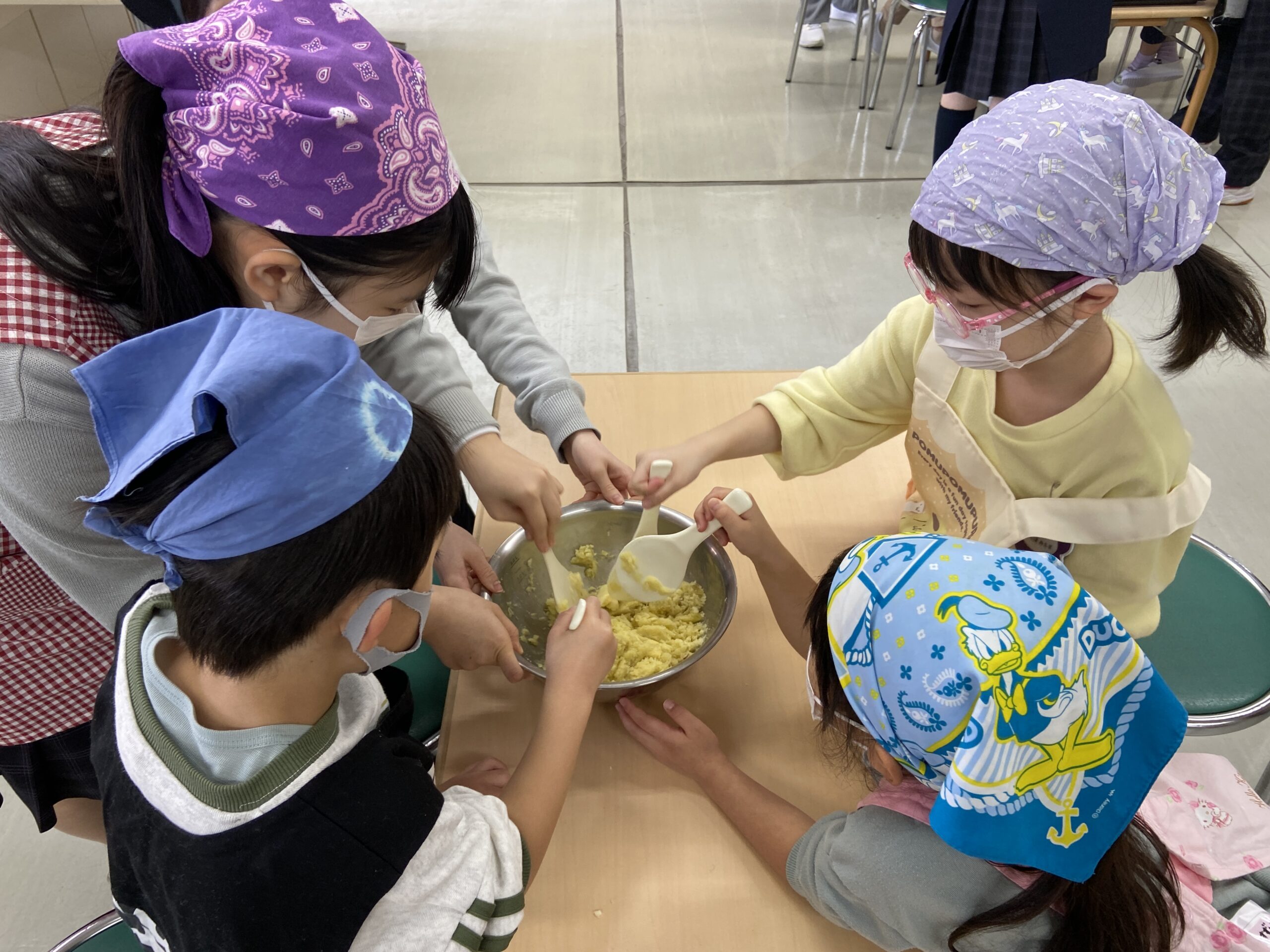 1A・2Aホームの生徒たちが、藤花幼稚園の園児と一緒に「スイートポテトづくり」を行いました。材料となったさつまいもは、生徒たちが自分たちで育て、収穫したものです。