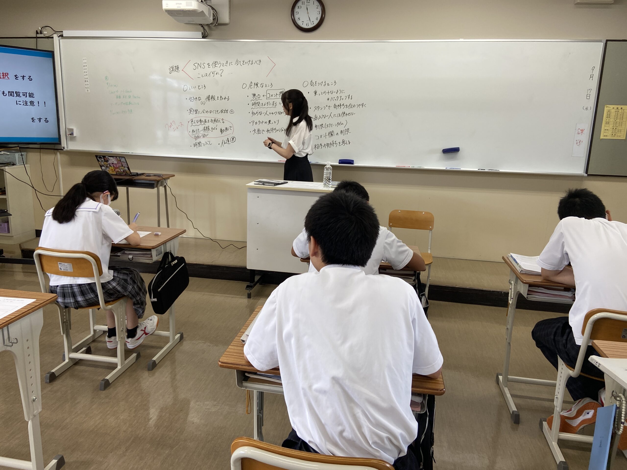 今日の授業では、SNS(ソーシャル・ネットワーキング・サービス)について取り上げ、便利な使い方だけでなく、情報発信にともなうリスクや注意点についても考えました。生徒たちは、身近なツールであるSNSを通して、情報社会における責任ある行動について理解を深めることができました。