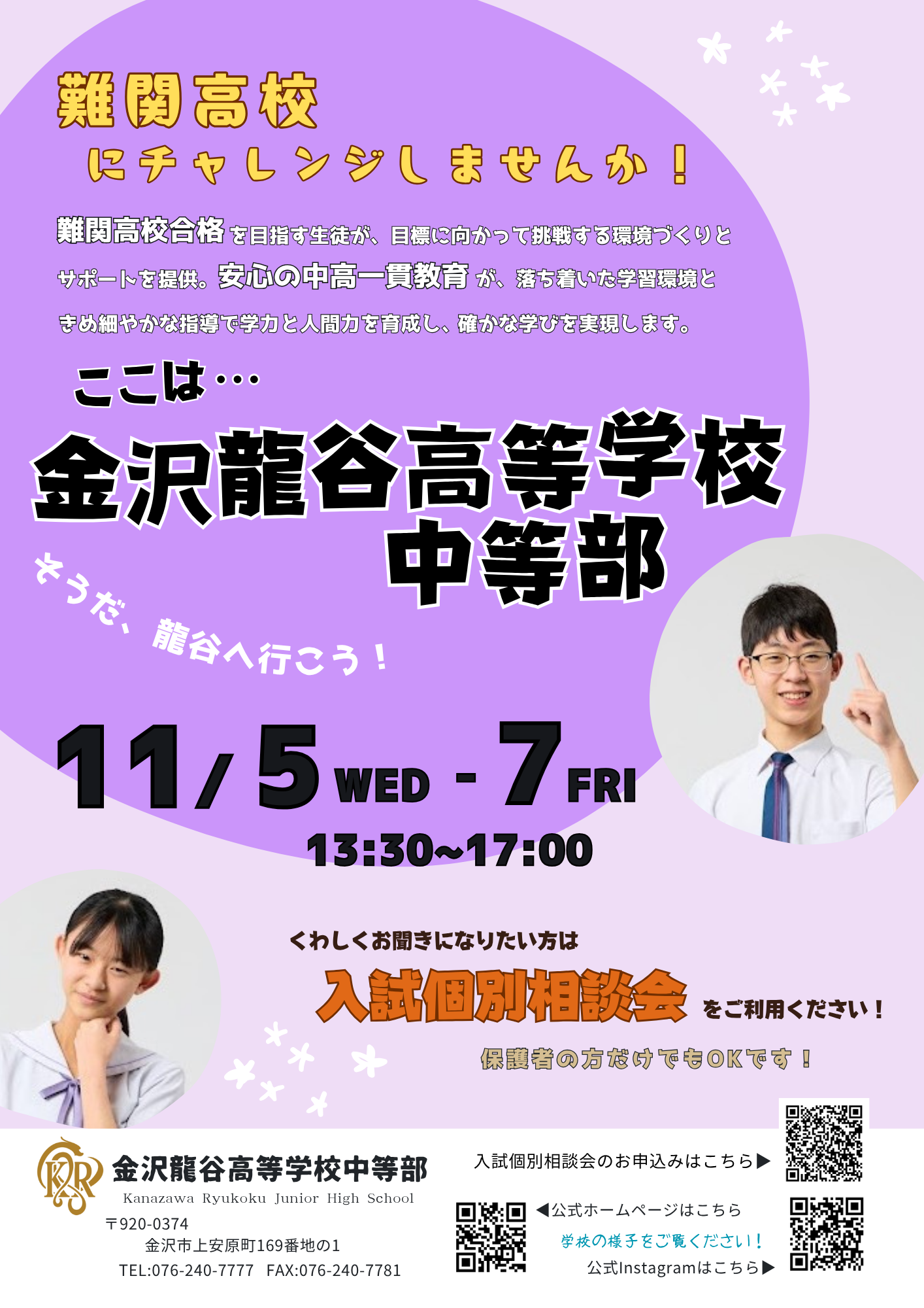 金沢龍谷高等学校中等部は、ひとりひとりの個性や目標に合わせて、最適な進路を選べる柔軟な学びの場です。