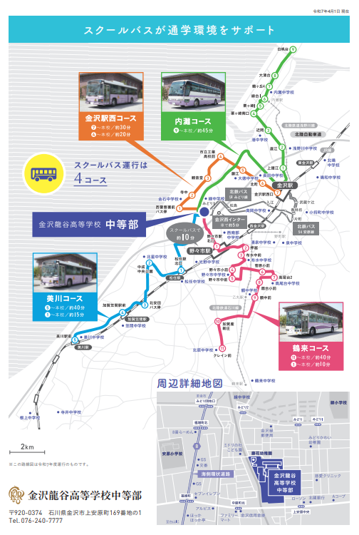 本校では、学校バスを全4コース運行しており、多方面から通学しやすい環境が整っています。